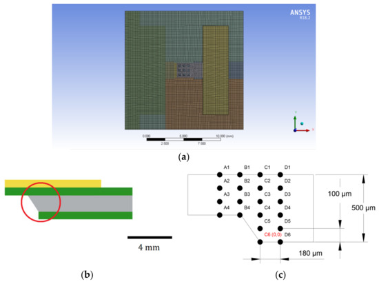 (a) Mesh, (b) location and (c) distribution of analyzed points in the simulation model of suspended sensing structure.