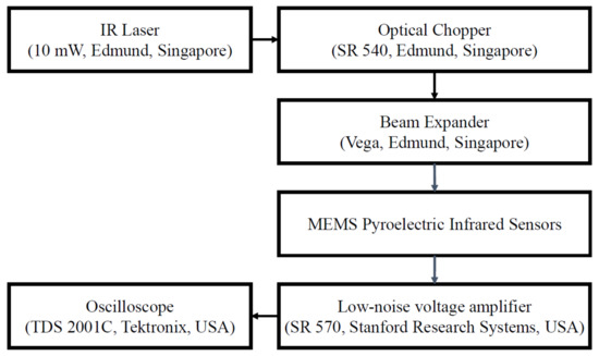 An experimental responsivity measurement system was established to further evaluate the performance of the ZnO pyroelectric sensors (see Figure 6). The radiation source had the form of a calibrated infrared (IR) laser with a maximum power of 10 mW and a wavelength of 765 nm. The laser beam was chopped and molded as a wave with a modulated frequency of w by an optical chopper and was then expanded by a beam expander such that the beam spot diameter had a size of 3 mm and thus covered the entire region of the patterned top electrode of the sensor. In performing the experiments, the distance between the infrared source and the sensing layer was set as 15 cm unless specified otherwise, and the output voltage of the sensor was amplified using an SR570 low-noise voltage amplifier. Finally, the output signal of the sensor was displayed and recorded using a digital oscilloscope.