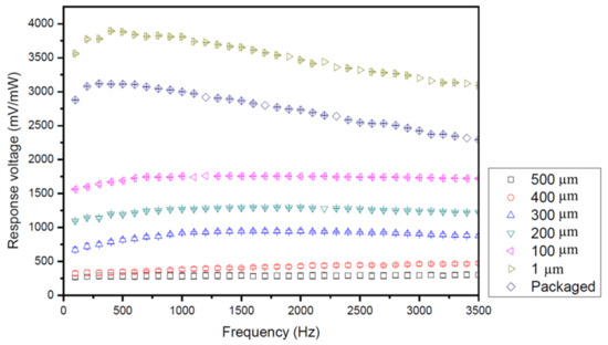 Figure 10 shows the experimental results obtained for the voltage responsivities of the ZnO pyroelectric sensors with different substrate thicknesses of 1, 100, 200, 300, 400, and 500 μm, respectively, at cutoff frequencies in the range of 0–3500 Hz. For comparison purposes, the responsivity of a packaged sensor is also shown. Note that the voltage responsivity is defined here as the ratio of the output voltage of the sensor to the input power of the incident heat source. As expected, the voltage responsivity increases with a reducing substrate thickness as a result of the greater temperature variation within the ZnO film. From inspection, the maximum voltage sensitivity is equal to 3800 mV/mW and is obtained for a substrate thickness of 1 μm and a cutoff frequency of 400 Hz. It is noted that the packaged sensor has a low voltage responsivity of just 3100 mV/mW due to connection losses and internal resistance losses, respectively.