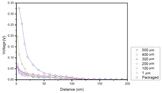 Figure 11 shows the output voltages of the various sensors at a cutoff frequency of 400 Hz for various distances of the sensor from the infrared power source in the range of 0–200 cm. For distances of less than 100 cm, the packaged sensor provides the highest voltage output among all the sensors. However, the sensor with a ZnO thickness of 1 μm also provides a reasonable response at sensing distances less than approximately 25 cm. For all of the sensors, the output voltage reduces to zero as the sensing distance increases beyond 100 cm.