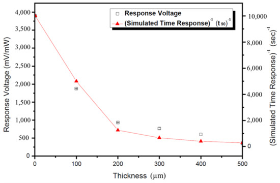 Voltage responsivity of sensors with substrate thicknesses of 1, 100, 200, 300, 400 and 500 μm and cutoff frequencies in the range of 0–3500 Hz.