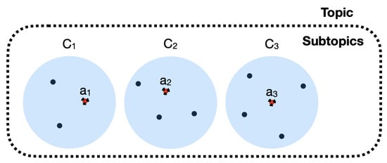It is crucial to stress that the definition of importance, and the following definition of gain, derives from the assumption that there is a known “reference” topic t that describes completely the information need. For such topic t the retrieved documents can be different compared to the ones observed for a query which represents just one aspect a of the topic. In Figure 1, we show an example of a number of subtopics found for a topic t and grouped into three clusters, each one with a representative aspect.