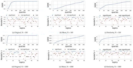 In Figure 2a,d,h, we show that the value of the gain saturates to 1 for most query reformulation. This is more evident when we increase the number of documents N of Equation (6) from up to N = 10,000. This behavior, due to the importance in Equation (1) that multiplies N numbers less than one, makes the GAIN not useful to discriminate the different query variants of an information need, since every variant will have gain equal to 1. In addition, when all the reformulations have the same gain, it is impossible to compute the Kendall correlation to predict the performance (black dots with correlation value 0 in the figure). Being not saturated is not by itself a desirable feature for the gain measure. Nevertheless, the faster the gain saturates, the harder it is to discriminate between different formulations. In this sense, a GAIN measure capable of spreading better the options in the entire domain is preferable.