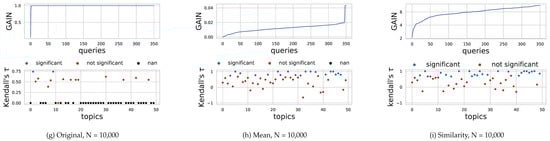 Given what we observed in Section 4.2, we are interested in understanding whether the GAIN-based proposed by [] (cfr. Equation (4)) can overcome the problems in this specific setting shown by traditional QPP models. The results are shown in Figure 2a,d,h. Each figure is divided into two parts: top, we show the distribution of values of the GAIN (or similarity), ordered increasingly, for each query reformulation (350 in total); bottom, we plot for each topic (50 topics) the value of the correlation Kendall between the query reformulations ordered by decreasing GAIN (or similarity) and the reformulations ordered by decreasing true recall. The blue dots indicate a statistically significant correlation greater (or lower) than zero, while black dots the topics for which it is not possible to compute the correlation.