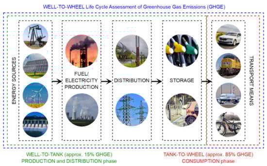 The European standard EN 16258 Methodology for the calculation and declaration of energy consumption and GHG emissions in transport (freight and passenger) was approved by the European Committee for Standardisation in 2012 [31,32,33]. Currently, there are three main approaches to the measurement of energy consumption and produced emissions [32]: Well-to-Wheel (hereinafter WtW), Well-to-Tank (hereinafter WtT) and Tank-to-Wheel (hereinafter TtW):