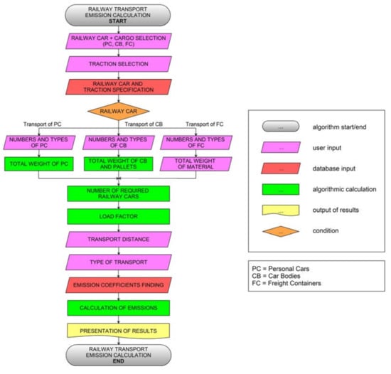 The customized approach to GHG emission calculations for RFT consists of five consecutive user steps. In the first step, the user selects a specific type of transported cargo (PC, CB, or FC) and a specific railway car (RC1–32). In the second step, the user selects between dependent or independent traction, or can choose the ratio of dependent and independent traction. Subsequently, information about the selected railway car and information about the selected traction is retrieved from the database of railway cars. In the next steps, the GHG emission calculations are different according to the type of transported cargo (PC, CB or FC).