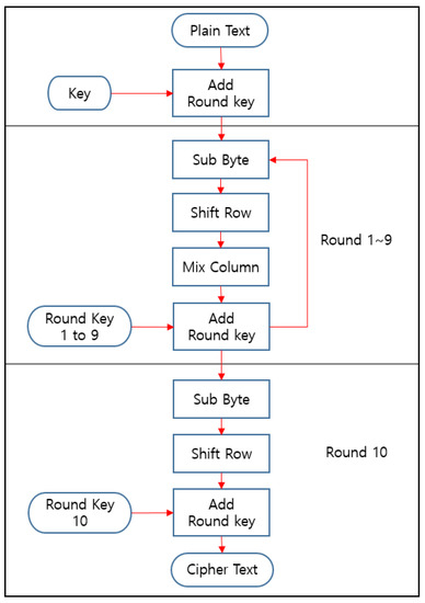 Figure 2 presents AES-128, with the round number as 10. The Add Round Key operation is performed by Plain Text and Key that were first entered. Nine round transformations consisting of Sub Byte, Shift Row, Mix Column, and Add Round Key are then performed. In Round 10, it finally performs Sub Byte, Shift Row, and Add Round Key conversion, except for Mix Column for encryption. Decryption is the opposite process of encryption.