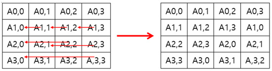 As we can see Figure 5, Shift Row performs shift operations differently on a row basis. Leave the first row. The second row 1 shifts to the left. The third row 2 shifts to the left. The last row 3 shifts to the left.