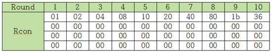 The AES uses a key schedule to expand a short key into a number of separate round keys. The key schedule produces the needed round keys from the initial key. In this process, the Rcon table (Figure 6) is used, and the XOR operation is performed.