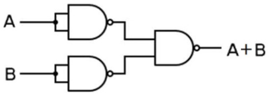 The classical OR gate can be made from a combination of NOT and classical AND gates. This is represented in Figure 9.