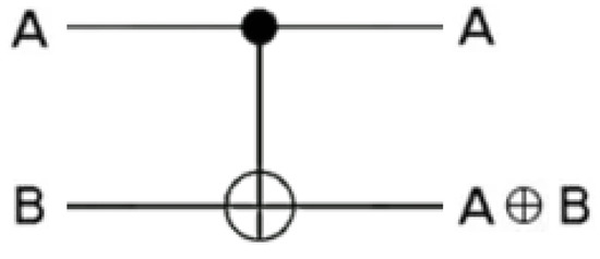 The classical XOR gate is shown in Figure 12. The classical XOR gate can be replaced with the controlled-NOT (CNOT) gate.