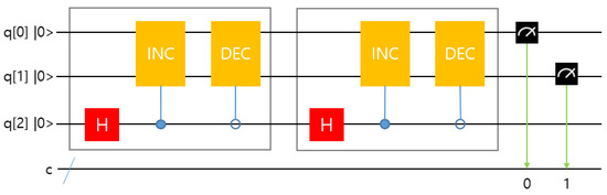 Figure 17 shows the whole process of the quantum random walk on a circular graph with 22 nodes (Figure 18). The gray rectangular frame means a set of coin and shift operators. In this circuit, q[0] and q[1] represent the state of the quantum walker, and q[2] represents the coin operator.