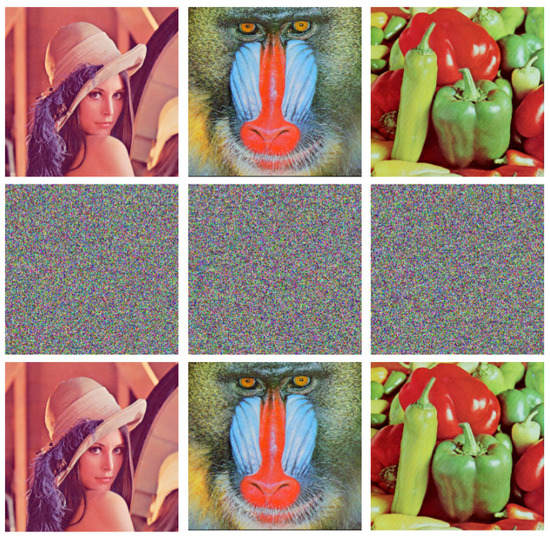 The images in the first row in Figure 20 are plain images; those in the second row are cipher images; and those in the third row are the recovered images from the cipher images.