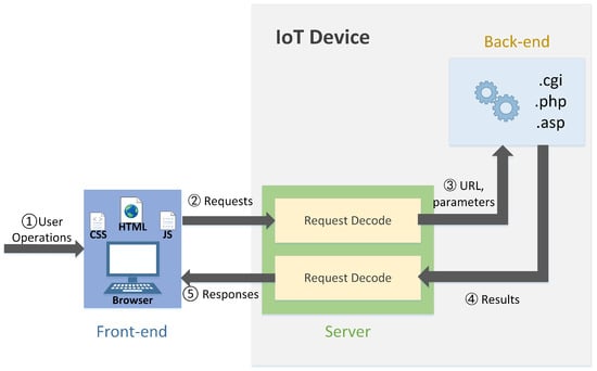Web interface communication usually consists of three parts as shown in Figure 1: front-end, server, and back-end [23]. The front-end is the browser used by the user, on which static resources such as HTML, CSS, and JS are running. The server and the back-end are both running in the IoT device, the server is a binary program such as httpd or mini_httpd, which is responsible for receiving and responding to the front-end and communicating with the back-end; the back-end is composed of some executable files like cgi, php, and asp files. The flow of interaction between the user and the web interface provided by IoT is shown in Figure 1. ① User operations are performed, such as filling the form in the browser, clicking buttons, and ajax events. ② The front-end browser sends the corresponding request to the IoT device. ③ The server component in an IoT device parses the request and obtains parameters from the message. Then the server chooses the corresponding back-end executable file, passes the parameters to it and executes it. ④ Result of the back-end execution is sent back to the server, and ⑤ the server packs up the feedback result and sends it to the front-end.
