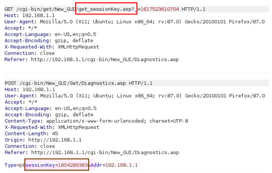 One obstacle is the state dependency in test cases. Take CVE-2019-7298 in the D-link DSL-3782 as an example, this vulnerability is located in the input box on the page Diagnostics.asp as shown in Figure 2. After filling this blank with a random IP address and clicking the “Run test” button, two requests will be sent from the front-end to the server in the target router, which is shown in Figure 3. The former is a GET request which asks the server to get a sessionKey. After receiving a sessionKey from the server, the front-end will append sessionKey as a form data to the form in the latter request. What an attacker does is just capturing these two request messages, modifying the value in the “Addr” field of the latter request with a long string, and replaying these two requests. Then the target router will crash due to buffer overflow.