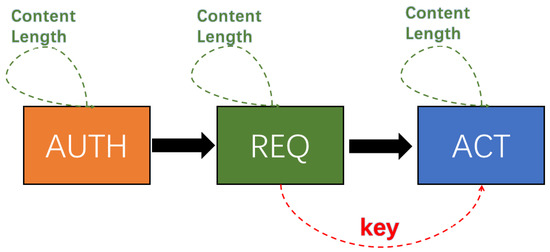 If there exists only one request, we denote this request as ACT and directly connect AUTH and ACT to construct a queue. Furthermore, if there is no request between two actions, we skip to the next two actions. Last but not least, we constrained each request with their content length fields to satisfy the intra-message dependency, which is shown as the green dotted arrow in Figure 4.