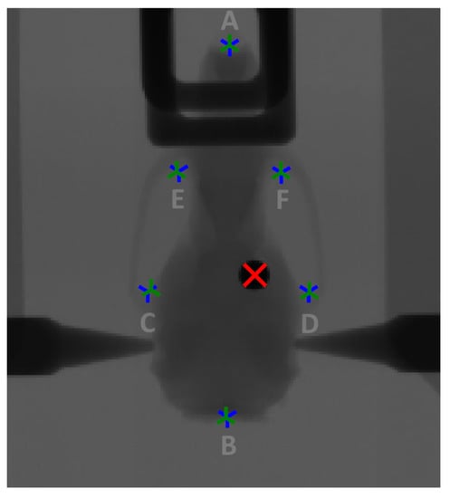 Figure 2 below shows a radiograph of the treatment phantom mounted on the DynMRT stage with overlays of the output of the rigid body co-registration process. The location of the red cross indicates the calculated location of the ball bearing as recorded on the CT scan showing good agreement to the visible location of the ball bearing from the conventional radiograph image. Further details of the image co-registration and translation calculations can be found in Barnes, 2018 [29]. The tumour of a patient would not be visible on this radiograph and so was ignored for alignment purposes, serving only as a validation. Figure 2 also identifies the six prominent skeletal landmarks used for registration between the DRR and conventional radiograph. They are (A) the distal tip of the median line, (B) posterior tip of the occipital bone, (C, D) left and right zygomatic process of the squamosal bone and (E, F) the left and right anterolateral corner of the frontal bone.