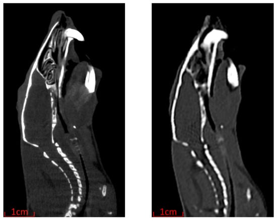 Sagittal reconstruction of rat comparing CT scan image quality. Inveon Multimodality System with 97 μm × 97 μm × 97 μm voxel resolution (left) and Siemens SOMATOM go.Up with 300 μm × 300 μm × 300 μm voxel resolution (right).