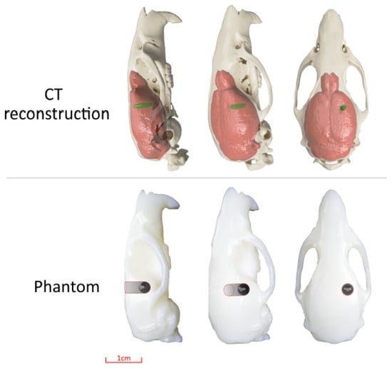 The three top images are CT reconstructed volumes of tumour a bearing rat skull, highlighting the brain volume (red) and tumour volume (green) for a range of angles from LR to AP. The three lower images are the corresponding angles of a plastic rat skull phantom with a hole (red) and implanted diameter ball bearing (grey) location super-imposed over each image.