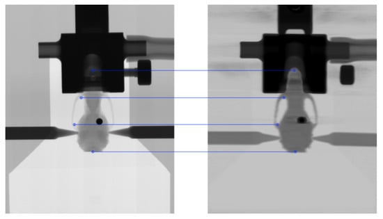 Images of rat skull phantom with embedded diameter ball bearing used for alignment. Planar X-ray radiograph from treatment room (left) and composite CT DRR (right). Blue markers indicate four of the corresponding alignment makers chosen in each image. For visual clarity of the figure, two markers on the RHS have been omitted.