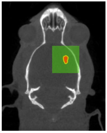 Coronal CT slice at 7 depth of tumour-bearing rat, one day before treatment. Overlaid gross tumour volume summed from all tumour depths (red), target volume with treatment margins (yellow), and extremities of the planned 8 mm × 8 mm treatment field (green).