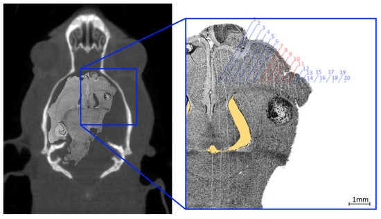 For histological analysis, a rat was euthanized with an intraperitoneal injection of lethabarb 14 days after MRT, using a 325 mg/mL solution to a dose of 800 mg/kg, according to Engels et al. [30]. The brain was collected by removing the skull and placed immediately in 10% neutral buffered formalin for fixation. Fixed brains were sliced transversely, processed through graded alcohols and xylene, embedded in paraffin, to obtain 4 sections. These sections were stained with haematoxylin and eosin. Histology images were acquired using a Leica DMI4000 B Inverted Microscope using multi-step (tiled) image acquisition with light field corrections applied presented in Figure 10.