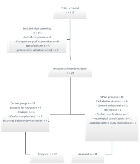 Patients were recruited between September 2014 and June 2016. In this time, a total of 113 patients were screened for inclusion in this study. Of these, a total of 34 patients were excluded for not meeting eligibility criteria: nine due to an anticipated deficit in compliance, 14 due to surgical intervention other than total knee arthroplasty, four denied consent. Seven patients were excluded due to planned changes in therapy, as preoperative evidence of infection in the knee joint was verified and no further data were collected on these patients. Of the 79 randomized patients, 66 partook in the study, although 40 were initially allocated to the NPWT group and 39 to the control group.