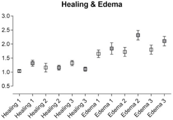Edema score from wound and wound edge over the three observation points. Shown is the mean with error bars indicating 95% confidence interval.