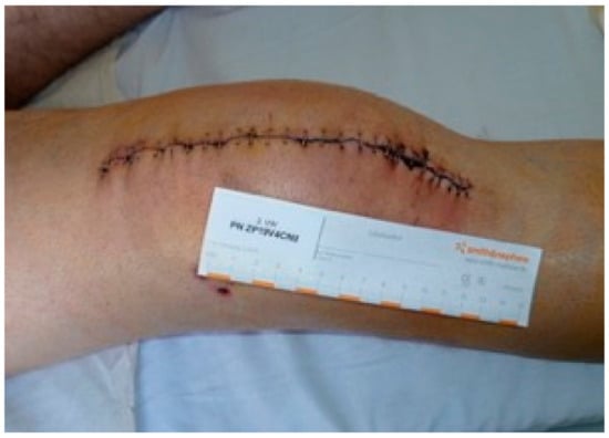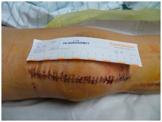 - Galat, D.D.; McGovern, S.C.; Larson, D.R.; Harrington, J.R.; Hanssen, A.D.; Clarke, H.D. Surgical Treatment of Early Wound Complications Following Primary Total Knee Arthroplasty. J. Bone Jt. Surg. 2009, 91, 48–54. [Google Scholar] [CrossRef]
