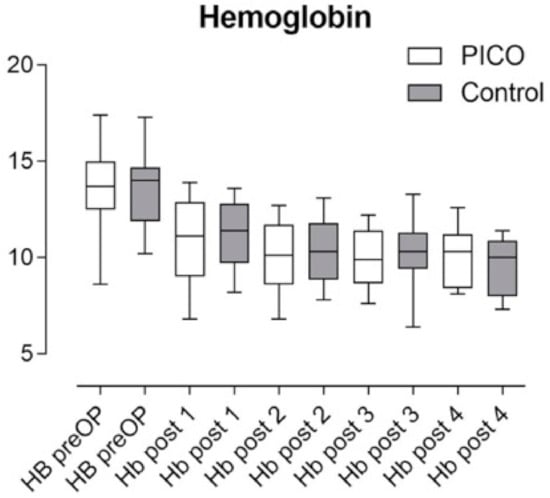 Wound length differed slightly in both groups with a mean length of 17.66 cm (standard deviation (SD) 3.2, range = 14–29 cm) in the study group and 20.0 cm (SD 5.2, range = 15–34 cm) in the control group but with no statistical significance (p = 0.07). We saw no difference in blood loss between the two groups, as measured by postoperative hemoglobin concentration (Figure 6). The same was true for the leukocyte count, c-reactive protein, and serum creatinine.