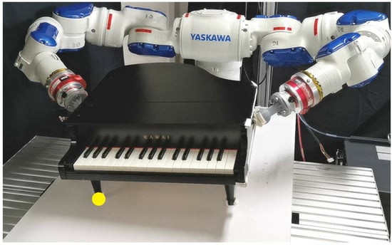 In this study, the target object is a toy piano sized 0.425 × 0.45 × 0.205 m with a weight of 3.1 kg. The piano is placed on a table, which is in front of the robot, and the size of the table surface is 0.9 × 0.6 m. We use a dual-arm Yaskawa Motoman SDA5F robot to manipulate the object. The two EEFs of the robot are the same and ball-shaped. They are produced by a 3D printer where the diameter of the ball is 4 cm. In addition, to increase the friction between the EEFs and the object, anti-slip stickers are added to the tip of EEFs.
