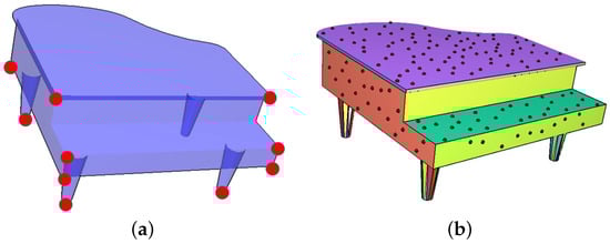 Object model analysis. (a) Vertices of the object (red points). (b) Contact points sampled on the object surface. The facets segmented by the superimposed segments are denoted by different colors. The contact points on the green surface are removed due to collision between the object and the EEF.