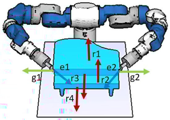 Selection of grasps with respect to the surface normals of the object and the rotational vector of the EEF (e1 and e2). The contact pairs on surfaces with normal vectors r1 and r2 are removed because collision occurs between the table and EEF if the EEF contacts the bottom of the piano. The contact pairs on surfaces with normal vectors r3 and r4 are removed because they are too far to be reached by the EEFs. The contact points on the surface with normal vectors g1 and g2 remain.