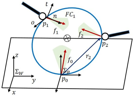 When pivoting, the object contacts two EEFs of the robot (see Figure 6). In addition, the object contacts the environment, such as the table. Considering these contacts, we can evaluate the grasp stability, which is the ability of an object to balance the external wrenches by the force vector f applied at each contact point: