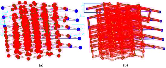 The graphs generated at the task level. The object poses are first sampled and shown in the left graph, then the right graph is built by combining grasp configurations. (a) Graph of the sampled object poses. The red nodes indicate the object poses in SP, whereas the blue nodes indicate USP. The red and blue edges indicate pivoting and tumbling motion, respectively. (b) Grasps combined with the graph shown in (a). Each node includes information on both the object pose and grasp configuration. Yellow edges are added, which indicate the regrasping to change the grasp poses.