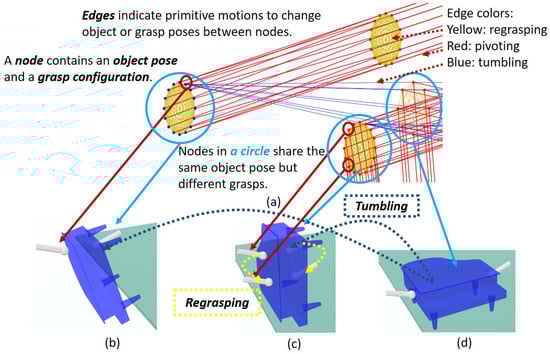 The detailed explanations of the graph are shown in Figure 11, where the blue rectangular part in Figure 10b is amplified. A node contains information on both an object and a grasp configuration. Nodes insides a light blue circle (which is drawn only for explanations in Figure 11 and is not included in the graph) indicate they share the same object pose but different grasp configurations. Three primitive motions are represented by edges where yellow, red, and blue edges imply regrasping, pivoting, and tumbling, respectively. The configurations saved in nodes can be transferred by the edges connecting them. For example, in Figure 11b, the grasp configurations of two nodes are changed by a yellow edge which implies regrasping. The design of SP and USP is also reflected in the graph where blue nodes indicate USP, see Figure 11b and red nodes indicate SP, see Figure 11c,d. What is more, there are fewer nodes within the right blue circle in (a) because there are fewer grasps as the contact surface in the current object pose is small, see Figure 11d.