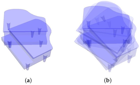 Example of pivoting motion to move a piano. (a) Two poses of the piano. (b) Transformation of the object poses shown in (a) through pivoting motion. The object is tilted, rotated around one vertex, and then placed down.