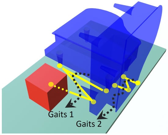Changing the base surface of the object improves the obstacle avoidance performance. The object’s base surface is the support surface between the object and the table. The proposed method has better collision-avoidance capability since pivoting gait is performed with the combination of tumbling and regrasping. By tumbling, we can control the area of support polygon and it contributes to the case when a manipulated object passes through a narrow passage. In addition, by regrasping, we may avoid the collision between the robotic arms and the environment. An example of the object motion is shown in Figure 13, where the gaits 1 cannot avoid the collision with the red obstacle since the object is not tumbled. If the object is tumbled to the right as shown in the right of Figure 13, the supporting polygon can be changed. Such a change allows the object to be moved without colliding the obstacle by performing the gaits 2. Tumbling motion contributes to change the type of gaits adaptively according to the environment.