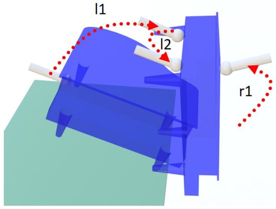 For changing the object’s base surface, we design tumbling motion, which is a special case of pivoting when the rotation passes through the object’s edge. Rotating an object up to SP is simple, where one EEF rotates the object around one edge (the line connecting the two supporting vertices) of the object until it moves to SP. The kinematics and dynamics of tumbling motion can be derived through minor modifications in (5)–(11). However, rotating an object up to USP is more complex. This is because to maintain an object in USP, the EEF must contact and hold the object, which leads to difficulty in changing the grasp poses. To solve this problem, we incorporate multiple arms to achieve regrasping by sequentially using different arms to contact the object. Figure 14 depicts a tumbling motion where the object is rotated to USP in the boundary of the table. If the right EEF does not contact the object, it will fall from the table. The tumbling motion is designed as follows: First, the left EEF contacts and rotates the piano (see motion l1). Meanwhile, the right EEF moves to the desired position, which is also the right EEF’s grasp pose for contacting the object in USP (see motion r1). The left EEF rotates the object until it contacts the right EEF. Next, the right EEF alone holds the object. The stability is evaluated by calculating the contact wrench of the contact between the right EEF and the object, as well as that between the object and table, as mentioned in Section 4.3. The left EEF then leaves the object and moves to the desired grasp configuration (see motion l2). Compared to regrasping with a gripper, which can only regrasp an object in SP, a multi-arm robot can regrasp an object in both SP and USP.