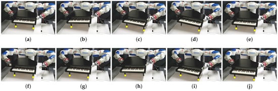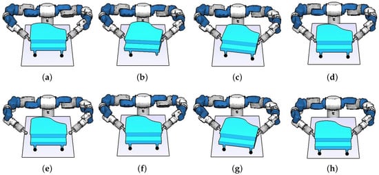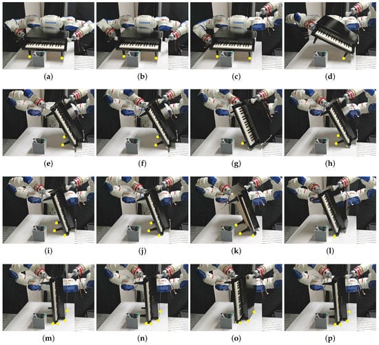 A grey pen holder is placed in front of the piano as an obstacle (see Figure 18a). The poses of the obstacle and the piano are input to the system. As the obstacle is very close to the piano, the piano cannot avoid collision by performing the pivoting gait using the sheering method. Therefore, the robot tries to tumble the piano. The right EEF moves to a new grasp configuration and prepares for the tumbling motion, whereas the left EEF moves to the planned grasp configuration preparing to catch and hold the object after rotation (see Figure 18b,c). The robot utilizes the right EEF to rotate the piano (see Figure 18d). Once the piano is in contact with the left EEF, the right EEF leaves the piano and moves to a new grasp pose (see Figure 18e,f). As a result, after the rotation, regrasping is performed by sequentially incorporating the right and left EEFs to hold the piano, which is an advantage of the dual-arm robot. Note that as the supporting table is narrow and the piano is near the table boundary, sufficient space is not available for the piano to be placed in SP and the left EEF is used to keep the piano in USP. For example, if the left EEF does not hold the piano, the piano will fall from the table (see Figure 18e). The USP design allows the robot to manipulate the object within a limited support space. Subsequently, the robot performs the pivoting gait designed for the USP, which is the DS gait mode (see Figure 18g,h). The robot places the piano in SP when there is sufficient space on the table, and then changes the grasp configurations (see Figure 18i,j). After regrasping, the robot pivots the piano for two steps along the y-direction (see Figure 18k,l) and then tumbles the piano to change the support surface through the right EEF (see Figure 18m). Finally, the robot regrasps the object and pivots it for two steps along the x-direction, and places it at the target location (see Figure 18n–p). During the entire process, there is no collision between the object and the obstacle.