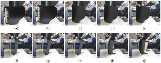 Experiment 1: The robot manipulates the object by pivoting in (a–d) and regrasping the object in (e–g). In (e), without regrasping, the robot cannot further move the object forward because the robot arms are close to the kinematic limit. However, after regrasping, the robot can move the object forward for two pivoting steps, see (h–j). The yellow dots indicate the object vertices that contact the table.