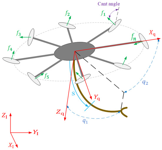 where is the cant angle from vertical, and represents the rotor’s position in the horizontal UAV frame and equals . In addition, d is the distance from the rotor center to the central axis of UAV (the radius of the n rotor). Moreover, is a sign parameter that is +1 for even motors and −1 for odd motors. If all cant angles ( are equal to zero, it means that all motors are perpendicular to the UAV horizontal plane and the generalized model will reduce to a conventional multi-rotors model.