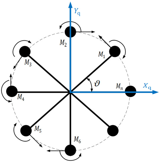 As discussed in the introduction, 6 DOFs’ control of multi-rotors can be achieved using a nonparallel thrust configuration. In such configurations, each propeller is rotated a cant angle, , around its radius. As shown in Figure 1, is the angle between the normal vector of each propeller plane and UAV’s vertical plane. These rotors are laid out along the edge of the disk canted tangentially to the edge of the disk [41]. This means that motors with odd and even numbers are rotated toward the left and right side of their radii, respectively. The position of n motors and their rotations and forces in the horizontal plane of the UAV are defined in Figure 3. In the body reference frame, it is assumed that the nth motor is located at the front of the UAV on the axis of the body frame. The other motors are located at angles , 2, 3, …, () with respect to the axis. Angle depends on the number of motors () and is given by .