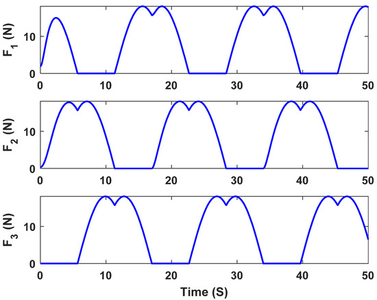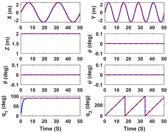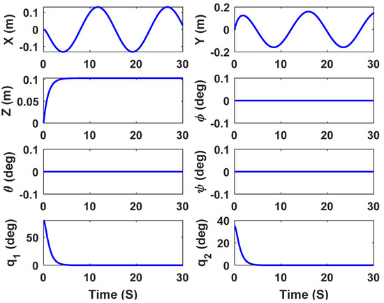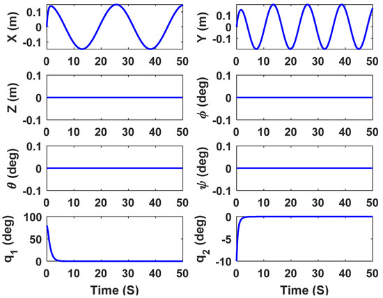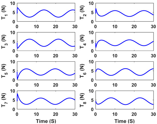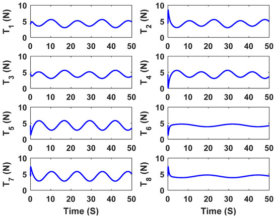 Figure 9, Figure 10, Figure 11 and Figure 12 present those results for the second control case, i.e., an infinity trajectory with a moving arm. Figure 9 illustrates ACMS states and their desired values. As it can be concluded from Figure 9 and Figure 10, similar to the previous case, ACMS tracks its desired values with a reasonable error. The error for tracking desired X is around 0.1 m while those of Y and Z directions are around 0.2 m and zero, respectively. Like the previous simulation scenario, UAV’s motors have to oscillate to generate required thrust to track the given infinity trajectory since desired Euler angles are considered zero. However, motor numbers 6 and 8 oscillate less than other motors according to Figure 11. Finally, required tensions of tendons to track a circular motion are presented in Figure 12. As expected from the tendon actuation policy (Table 2), only two tendons are activated at the same time depending on values.