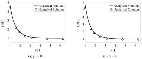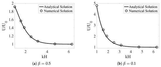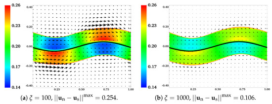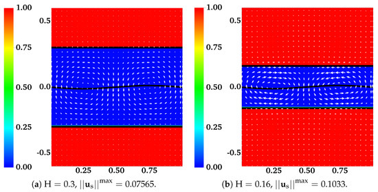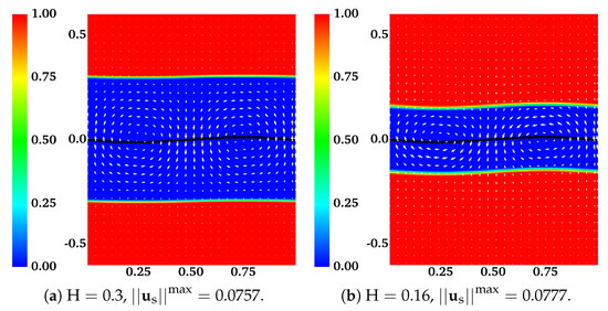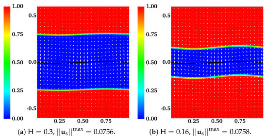 In this section, we illustrate the accuracy of the numerical algorithm by comparing our simulation results with analytical solutions. In [11,12], the swimming speed is calculated for an infinite waving sheet in a viscous two-fluid domain, where a low-viscosity fluid layer near the swimmer is surrounded by a more viscous bulk fluid. For reasonable comparisons with asymptotic solutions, we choose so that . As the initial profile, we set and so that the inner fluid layer only contains solvent and the bulk fluid only contains network. each fluid layer only contains a single fluid. Note that the force balance Equations (4) and (5) become degenerate over the region with or . To avoid this difficulty, we regularize the discrete equations by temporarily adding a small positive constant to throughout the entire domain and solve the same set of two-fluid equations everywhere. The value of is reduced by the same constant to maintain the condition . A large frictional coefficient is chosen so that the two velocity fields and are approximately the same.