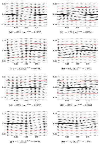 . Distributions of , the profiles of swimming sheet (black curves) and fluid interfaces (red curves) for different . (a,c,e,g) are for . (b,d,f,h) are for . All vectors have the same scale.