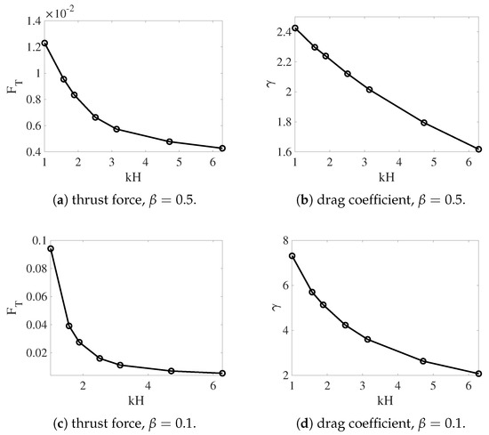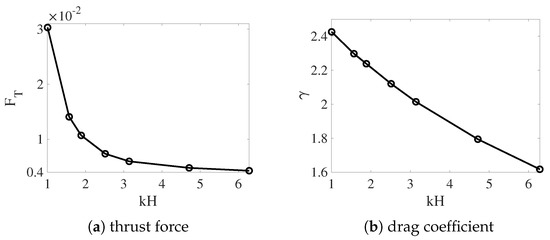 Thrust and drag coefficient vs. the nondimensional interface height for different . The fluid interfaces are deformable.