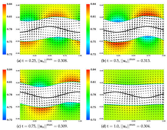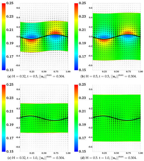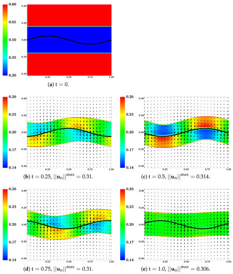 In Figure 10, the distributions of and are plotted at different time for the simulation in which , , and is set to at the initial time. To give a better contrast, white color is used to fill regions with , where is the largest value of observed near the sheet during the simulation. In Figure 10b–e, the boundaries of the colored region (contour lines of ) are referred to as the “fluid interfaces”. As time progresses, spatial inhomogeneities in and deformations of fluid interfaces appear with the waving motion of the sheet. Compared with the plots at and , there are more significant inhomogeneities in the spatial distribution of at the half wave period . Interestingly, it is also at that the fluid interfaces and the swimmer have approximately the same phase. At one wave period , the distribution of network volume fraction roughly returns to its initial value of over the entire inner layer. At , although the fluid interfaces do not fully return to their horizontal positions, their vertical deformations are the smallest within the wave period. Relative to the results at earlier time, the network velocity tends to have smaller -components at . The distributions of over the outer layers of fluid and the solvent velocity are plotted in Figure 11. Here white color is used to fill the region where , with being approximately the smallest value of in the outer layer. The fluid interfaces and in the plot exhibit similar periodic patterns in time as observed in Figure 10. Notice that due to the numerical smearing, there is a small vertical displacement (about 2 grid blocks) between the fluid interfaces visualized in Figure 10 and Figure 11. At one wave period , -components of the solvent velocity have smaller magnitude than those at earlier time. Due to its low viscosity, the solvent has greater motion than the network in the vicinity of the swimmer.