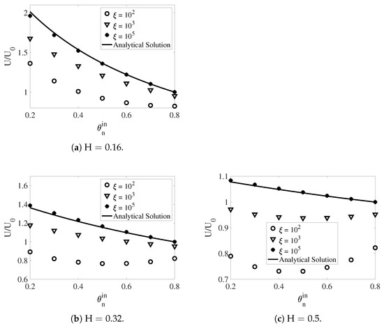 The scaled swimming speed vs. the nondimensional interface height for different . The fluid interfaces are non-deformable. The analytical solutions are from [12].
