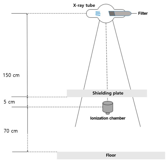 In addition, to evaluate the shielding performance of the tungsten plate, a diagnostic X-ray generator (Toshiba E7239, 150 kV-500 mA, 1999, Tokyo, Japan) was used. As is the case in medical radiation, the tube current was fixed at 200 mA, and the experiment was conducted at tube voltages of 40 kVp, 60 kVp, 80 kVp, 100 kVp, and 120 kVp, consistent with the range used in human radiography. A radiation dose detector, Mo.9517 Radiation Monitor (Radcal Corporation, Monrovia, CA, USA), and an Mo10×5-6, 6 cc ion chamber (Radcal Corp.) were used. Both radiation detectors were inspected and calibrated before use. Figure 1 shows the experimental setup for the evaluation of the shielding performance of the tungsten plate manufactured via the rolling method. The equivalent test method for the X-ray protection of products used in Korean Industrial Standards (KS A 4025: 1990, 2009 confirmation) was applied [31].